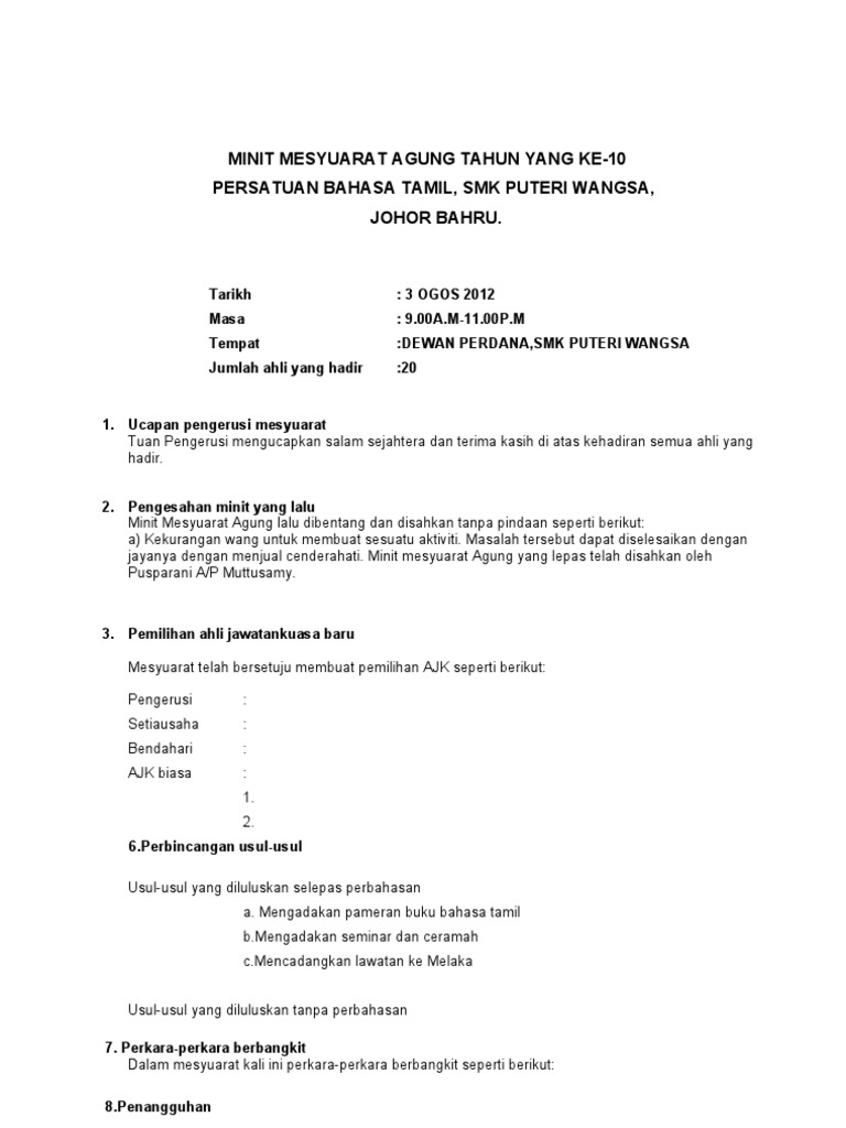 Contoh Minit Mesyuarat Agung Persatuan Pdf